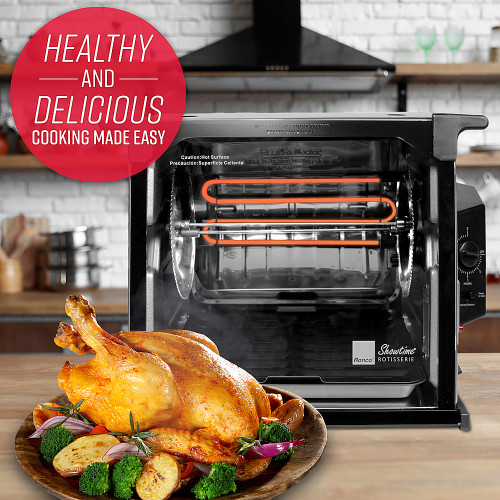 SKU: 6440970Model:ST4023SSGENCook like a gourmet with the Ronco Showtime Classic Edition Rotisserie Oven. Make perfectly roasted chickens, turkey, pork, roasts, and burgers that are delicious and healthy too. Its large capacity accommodates a 15-pound turkey or 2 whole chickens while still fitting on your countertop! The three cooking options allow you to Roast with normal rotisserie rotation, Sear to pause rotation and stop food in front of the heating element, and No Heat Rotation to keep juices evenly distributed before serving. An adjustable timer will automatically shut-off when cooking time is up which means no more worrying about overcooked food. The included multipurpose basket accommodates a variety of food including burgers, sausages, fish & vegetables so can roast a variety of foods with the ease of a rotisserie oven. Ronco rotisserie ovens feature dishwasher safe parts for easy clean up.FeaturesLarge Capacity OvenThe interior is large enough to cook up to a 15 lb turkey or 2 whole chickens at a time but at only 13 inches tall and 17.25 inches wide, the Showtime Classic Rotisserie is compact to fit under cabinets for easy storage when not in useSelf-Basting RotationThe classic Ronco rotisserie design locks in flavor and seals in natural juices while the removable heat reflector helps brown meat to perfection giving you tender, mouthwatering rotisserie chicken at home, anytime3 Simple Cooking SettingsWith three simple cooking settings, Roast, Sear, and No Heat Rotation, the Ronco Showtime Classic Rotisserie has the perfect preset temperature and rotation speed to evenly brown foods. No guesswork needed!Healthy & DeliciousRotisserie cooking seals in flavors while unwanted fat and grease melts away so you are left with deliciously moist, flavorful, healthier poultry and roasts. Perfect for preparing Keto friendly, low carb mealsAuto ShutoffA dial controlled, 3 hour timer makes the Ronco Showtime Classic Rotisserie Oven as easy as ever to use and will automatically shut off when time is up so you don’t have to worry about overcooked foodsMore Than ChickenThe included multi-purpose basket lets you enjoy deliciously roasted foods such as fish, vegetables, hamburgers, sausages and more while taking advantage of the hands-off simplicity of the rotisserie ovenSimple Clean UpThe oven’s interior surface wipes clean with a damp cloth while the removable glass door and drip pan are dishwasher safe so clean up is as effortless as the cooking!Classic Edition IncludesRonco Classic Rotisserie Oven, multi-purpose basket, rotisserie spit, carving platform, removable drip tray, oven gloves, food ties