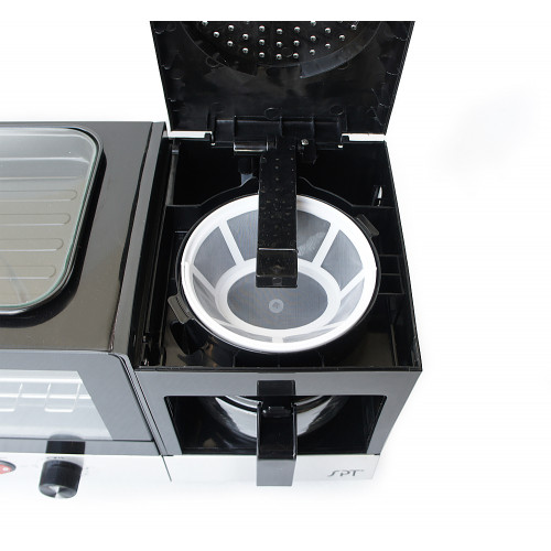 SPT 3-in-1 Breakfast Maker combines all the breakfast necessities into one: Toaster Oven, Coffee Maker and Oven-Top Griddle. The new black cabinet with stainless steel control panel gives it a modern and sleek look. This is the perfect compact appliance for dorms, offices, RV’s, studios or wherever space is limited. You can brew a fresh cup of coffee, toast couple slices of bread and fry up an egg all at once!