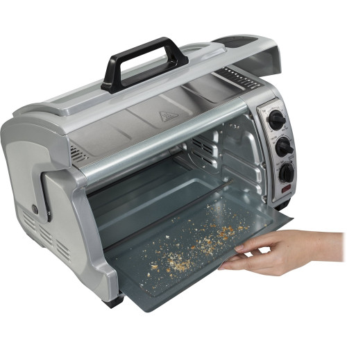 FeaturesEASY ACCESS TO FOOD AND COUNTERTOPThe roll-top door moves up and out of the way so you can have safe, easy access to your food before, during and after cooking.EASY TO KEEP CLEANDoor is up and out of the way of messy spills and drips.BAKE, BROIL & TOAST2 rack positions and included bake pan makes it easy to get started on cooking a variety of foodsFITS 6 SLICES OF TOAST, 12” PIZZA AND 9”x11” BAKE PANSpacious interior gives you room for cooking everything from snacks to side dishes.EASY-TO-USE CONTOURED KNOBSNot only is this new design easier to maneuver, but they’re safer too.