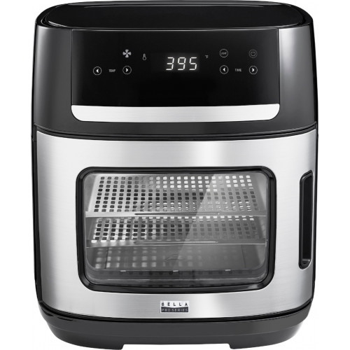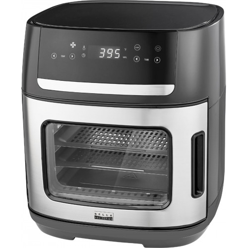 SKU: 6412331Model:90116Experience versatile cooking with the Bella Pro Series 4-Slice Convection Toaster Oven + Air Fryer with Dehydrator & Rotisserie Settings. Air Fry, Dehydrate, Rotisserie, Grill, Roast, Bake, Broil, and Reheat your favorite meals with consistent results every time. The extra-large capacity fits a 10” pizza, 2.2 lbs. of french fries, 4 slices of bread, and a 4 lb. chicken. The powerful 1500 watt heating system uses High Performance Circular Heat Technology to circulate heat for fast, crispy, and evenly cooked results every time. 10 convenient preset menu options, adjustable temperature range from 90°F to 400°F and 24 hour auto shutoff timer with audible tone. Easy cleanup with the dishwasher safe removable accessories.FeaturesExtra-large capacityFits a 10-inch pizza, 2.2 lbs. of french fries, 4 slices of bread, and a 4 lb. chicken.1500W of powerHigh Performance Circular Heat Technology circulates heat for fast, crispy, and evenly cooked food.10 appliances in 1Air Fry, Roast, Broil, Bake, Reheat, Keep Warm, Pizza, Bacon, Dehydrate, and Rotisserie with little to no oil.Intuitive digital touchscreenSelect from the 10 preset menu options with just one touch, or easily control and adjust the temperature (90-400°F) to accommodate a variety of recipes.Automatic shutoffThe integrated 24-hour timer automatically shuts off with an audible tone for added safety.Easy to cleanThe pizza pan, air fry racks, drip pan, rotisserie, and rotisserie holder are dishwasher safe.Stainless steel finishThe sleek stainless steel finish adds style to any kitchen.