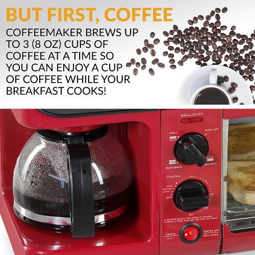 SKU: 6421715Model:BST3RRBring the family together and make a complete breakfast with just one appliance. Enjoy a cup of coffee with the four-cup coffee maker, then treat the family to a variety of breakfast meats and eggs cooked on the large, non-stick griddle. The multi-functioning toaster holds up to four slices of bread at a time, and is perfect for 7-inch frozen pizzas, hot sandwiches, desserts and more. For added safety, a 30-minute timer is included with automatic shut off. When the meal is done, the griddle and oven tray remove for easy cleanup.Features3-IN-1This versatile breakfast station covers your entire morning breakfast, allowing you to make your coffee, toast and eggs all at once!MULTI-FUNCTIONING TOASTERThe toaster oven has a 30-minute timer with a glass door and can fit up to 4 slices of bread, a 7-inch pizza and can be used to make casseroles, cookies and other delicious meals4-CUP COFFEE MAKERThis coffeemaker brews up to 4 cups at a time in minutes so you can enjoy a cup of coffee while your food cooks. Comes with a glass carafe, a coffee scoop and a reusable filterFAMILY-SIZED GRIDDLEThe large non-stick griddle offers plenty of room to fry eggs, omelets, pancakes, sausages, bacon, hashbrowns and other breakfast foods - and comes with a glass lidEASY CLEAN UPAs if cooking isn t easy enough, the oven tray, wire wrack, crumb tray and nonstick griddle are removable, making cleanup a breezeCOMPACT DESIGNSpace-saving 3-in-1 design is perfect for small kitchens, apartments, dorms, campers/RVsCONTROL PANELChoose between your desired settings - Grill, Toast/Bake, Warm/Heat, or Oven Off. The indicator light will let you know when unit is on